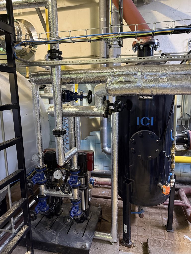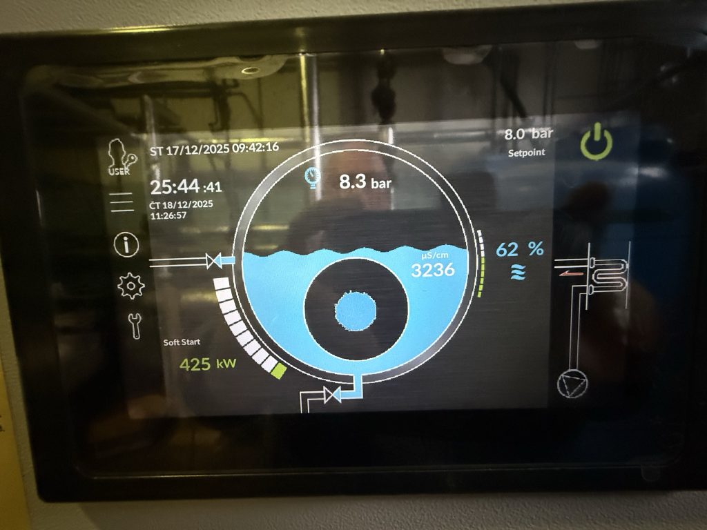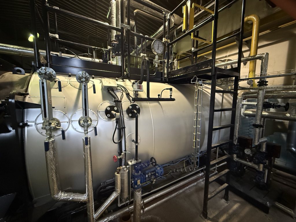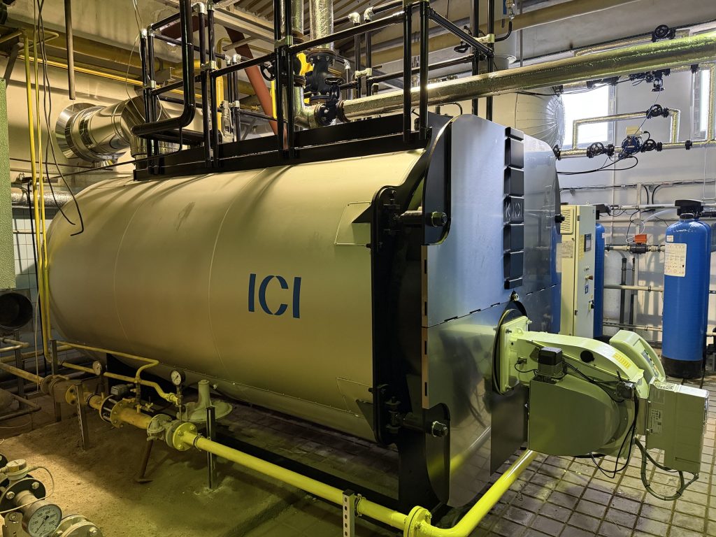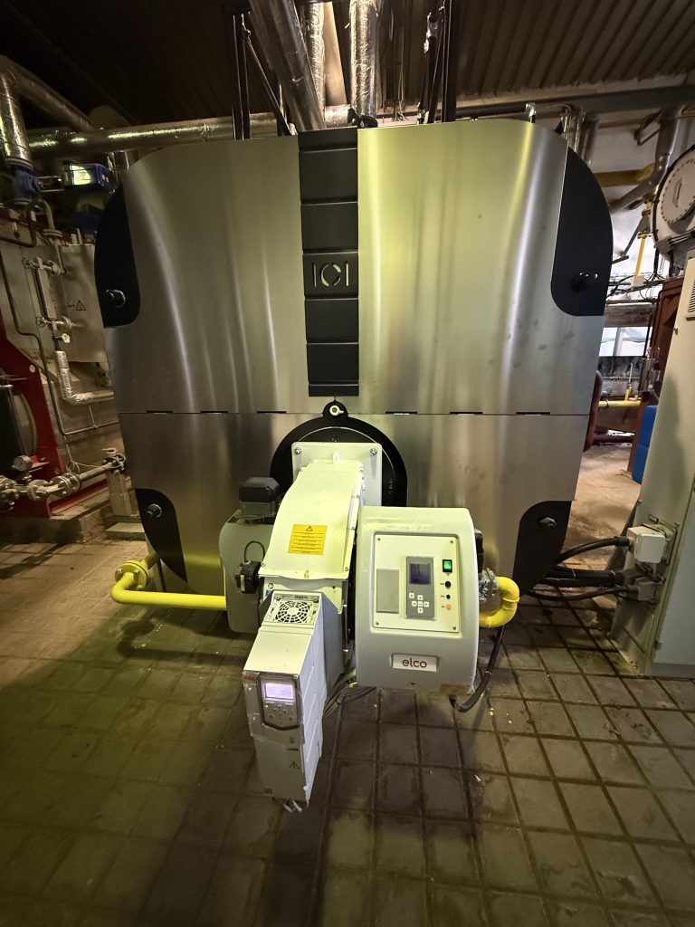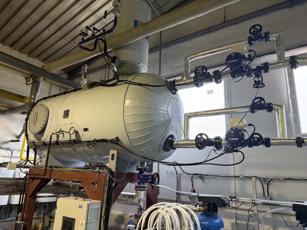 ELCO EK-TRON 5.300G-EF3 včetně napájecí nádrže s protiproudým kaskádovým odplyňovačem. Kotel je vybaven ekonomizérem a modulací doplňování vody, přičemž celková účinnost dosahuje 95,5 %. Dále je kotel vybaven příslušenstvím pro bezobslužný provoz do 72 hodin schváleným orgánem dohledu TIČR.